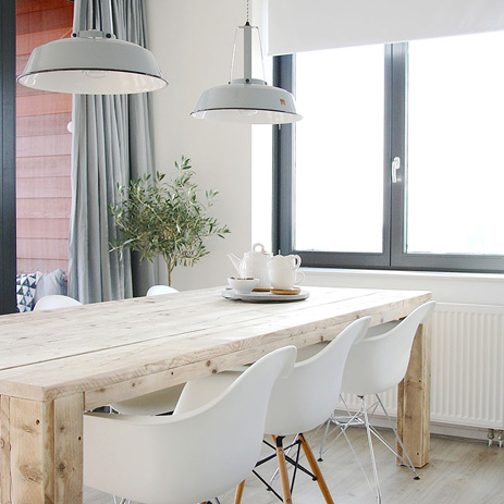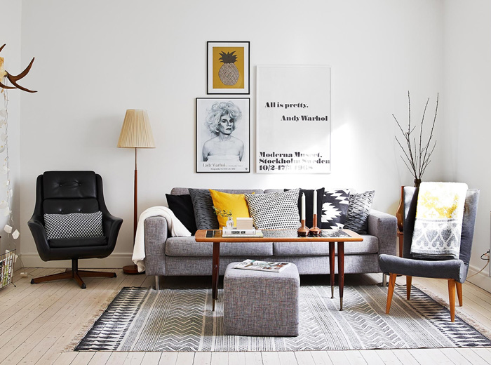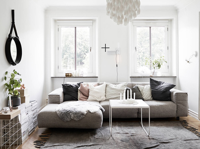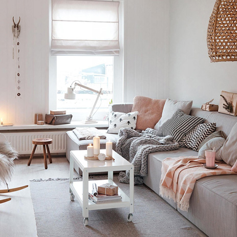 Play with textures. Mix-and-match different textiles, the more the merrier. A thick wool throw, linen pillows, (faux) sheepskin draped over the sofa, or a Moroccan trellis area rug are all popular options.